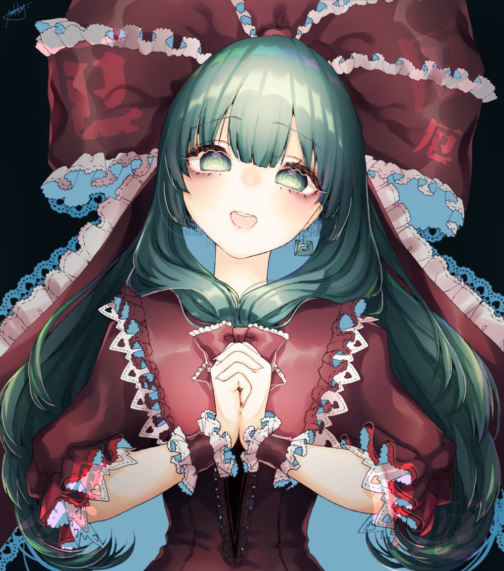 A young woman emerged from the forest. She wore a red and black lace-trimmed dress along with shiny black knee-high boots. Her hair was bright green, tied with a frilly red ribbon as large as her head. Her skin was pale and flawless, and her sweet smile and vacant green eyes made her look to Daiyousei like a doll herself, a pricey porcelain creation of the village artisans.