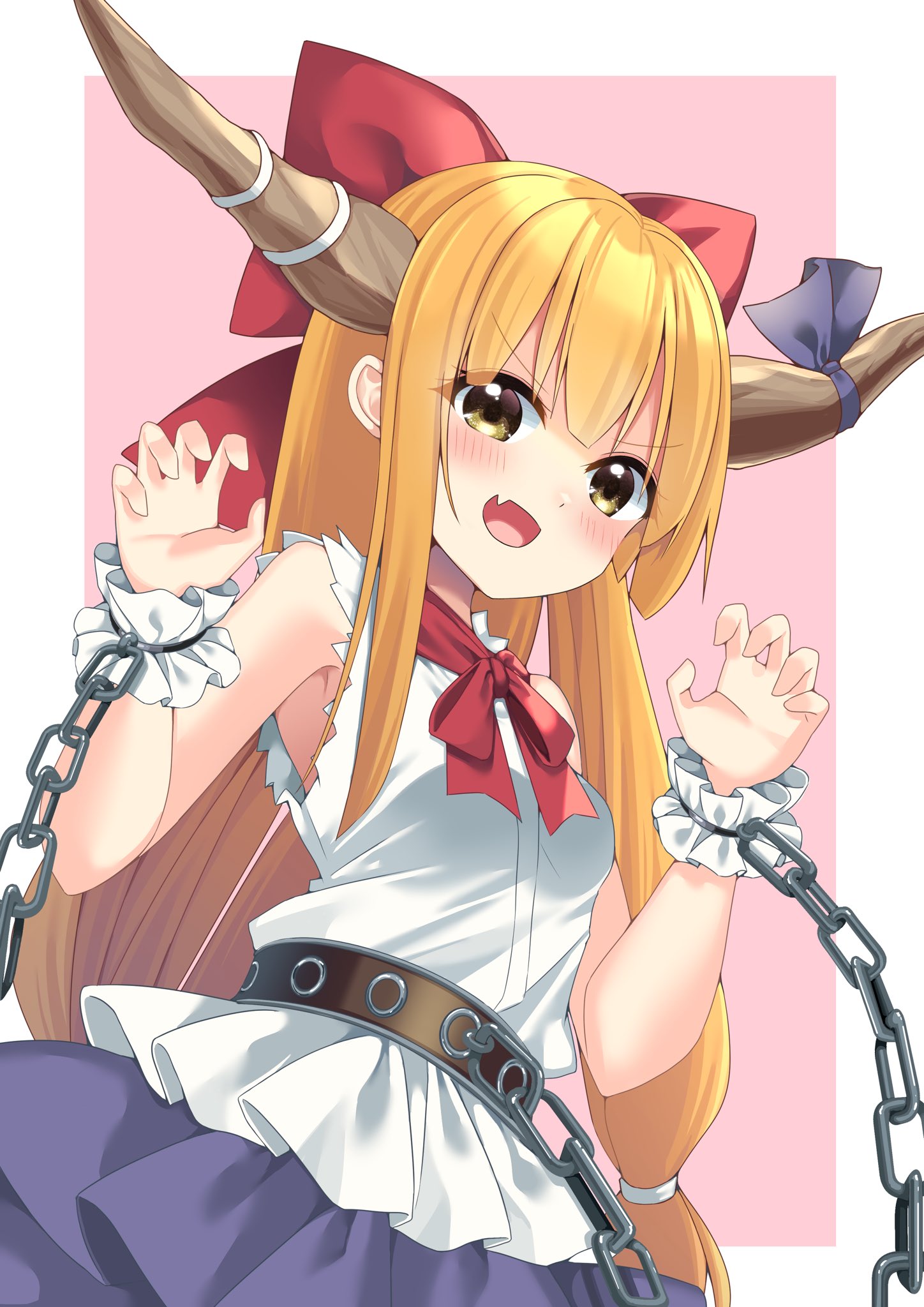 Asked what she knows of the current state of the Hakurei Shrine, Miss Kirisame offered little insight. She herself seemed unclear on many aspects of the shrine’s lacking upkeep and lagging business. Despite her awareness of Ibarakasen’s presence, she looked slightly caught off-guard when told that the hermit was feeding her friend and sweeping the grounds. One small insight she did inadvertently offer was that others visiting included noted oni Ibuki Suika. However, the witch couldn’t say what those visits might be about, just that she herself often dodged the oni as she came in to make her surreptitious donations. Should I encounter her in future investigations, I will be questioning Miss Ibuki.