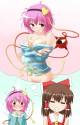 Two girls are chilling in the back, one with pink hair, a piercing gaze, and some weird-ass eyeball and hearts hair ornament, and the other, a kind of... well, you hate to put it this way, dopey-looking girl with long black hair and an extremely oversized brooch to match her extremely oversized chest. It's like she thinks she's Flava Flav or something.