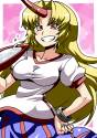 "Well, ain't you mighty concerned 'bout everyone's well-bein' tonight," Yuugi teases. "Nah, you don't have to worry too much 'bout her, really. She bounces back quick, that kid." A faint smile plays across Yuugi's face for a moment, like she's remembering a pleasant memory, before her attention returns to you.