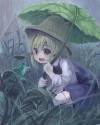 Out of the corner of your eyes, you notice something unusual. There's an unfamiliar girl squatting down at the edge of the pond. With nothing but a wide-brimmed hat with bulging eyes perched on top protecting her from the rainfall, the golden haired girl is staring at a frog in front of her with great interest.